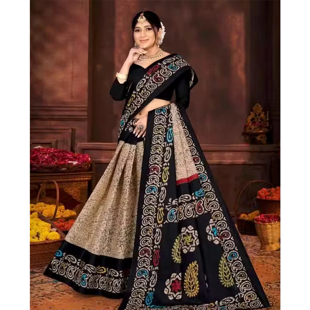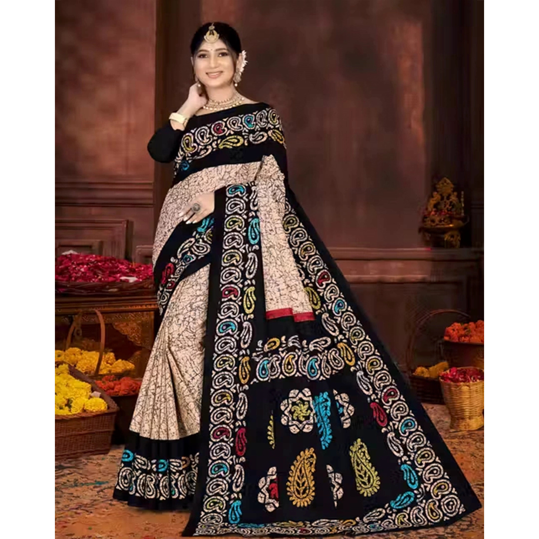 Home - Women Fashion - Elegant Ethnic Print Black & Beige Cotton Saree